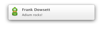 Adium features comprehensive support for visual notifications by ways of OS X's very own Notification Center (on OS X 10.8 and later), third-party software Growl as well as built-in notifications called "Mist" (on OS 10.7 and older).